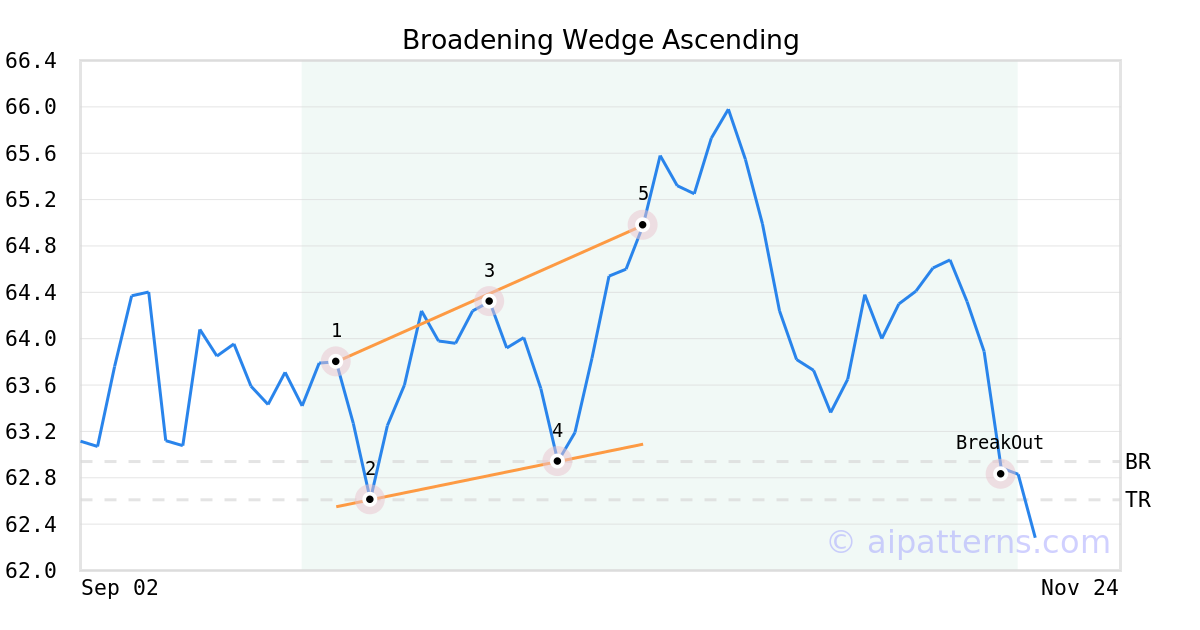 On October 17, 2025, A.I.dvisor detected a Broadening Wedge Ascending Pattern (Bearish) for Invesco S&P Global Water ETF (CGW, $64.98). 31 days later, on November 17, 2025, A.I.dvisor confirmed the Bearish pattern, setting a target price of the stock. On November 17, 2025, the stock hit the target price of $62.61 – resulting in a gain for traders who shorted the stock on the pattern detection date.