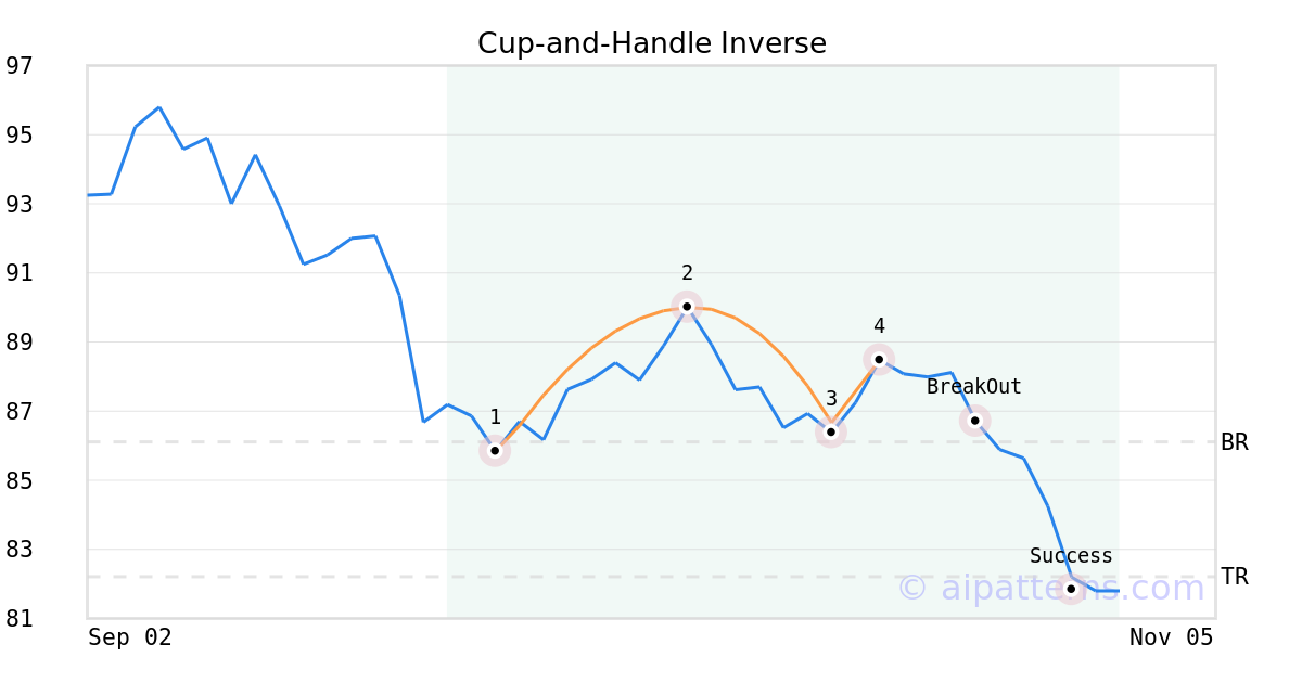 On October 17, 2025, A.I.dvisor detected a Cup-and-Handle Inverse Pattern (Bearish) for Church & Dwight Co (CHD, $88.48). 6 days later, on October 23, 2025, A.I.dvisor confirmed the Bearish pattern, setting a target price of the stock. On October 29, 2025, the stock hit the target price of $82.21 – resulting in a gain for traders who shorted the stock on the pattern detection date.