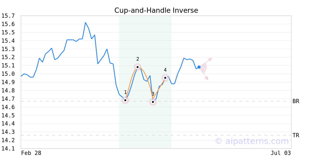 A.I.dvisor detected a bearish Cup-and-Handle Inverse pattern for CILGX stock. This pattern was detected on May 06, 2024 . The odds of reaching the target price are 6. The Inverted Cup-and-Handle (sometimes called Inverted Cup-and-Holder) pattern forms when prices rise then decline to create an upside-down “U”like shape (1, 2, 3, also known as the Cup), followed by a shorter relatively straight price increase that bounces from the right lip (from 3 to 4, creating the Handle). Consider selling the security short or buying a put option at the downward breakout level. The confirmation move is the breakout of the price below the right cup lip.