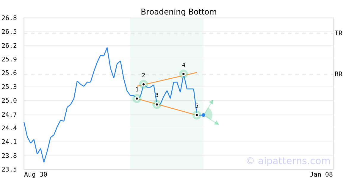 The Broadening Bottom pattern is formed when the price of a security progressively makes higher highs (2, 4) and lower lows (1, 3, 5) following two widening trend lines.
