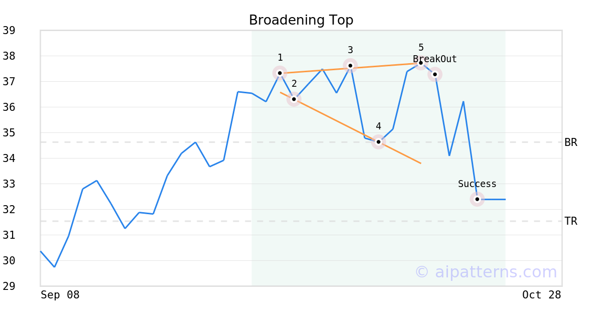 On October 15, 2025, A.I.dvisor detected a Broadening Top Pattern (Bearish) for Caledonia Mining Corp (CMCL, $37.72). 1 day later, on October 16, 2025, A.I.dvisor confirmed the Bearish pattern, setting a target price of the stock. On October 21, 2025, the stock hit the target price of $31.54 – resulting in a +1 gain for traders who shorted the stock on the pattern detection date.