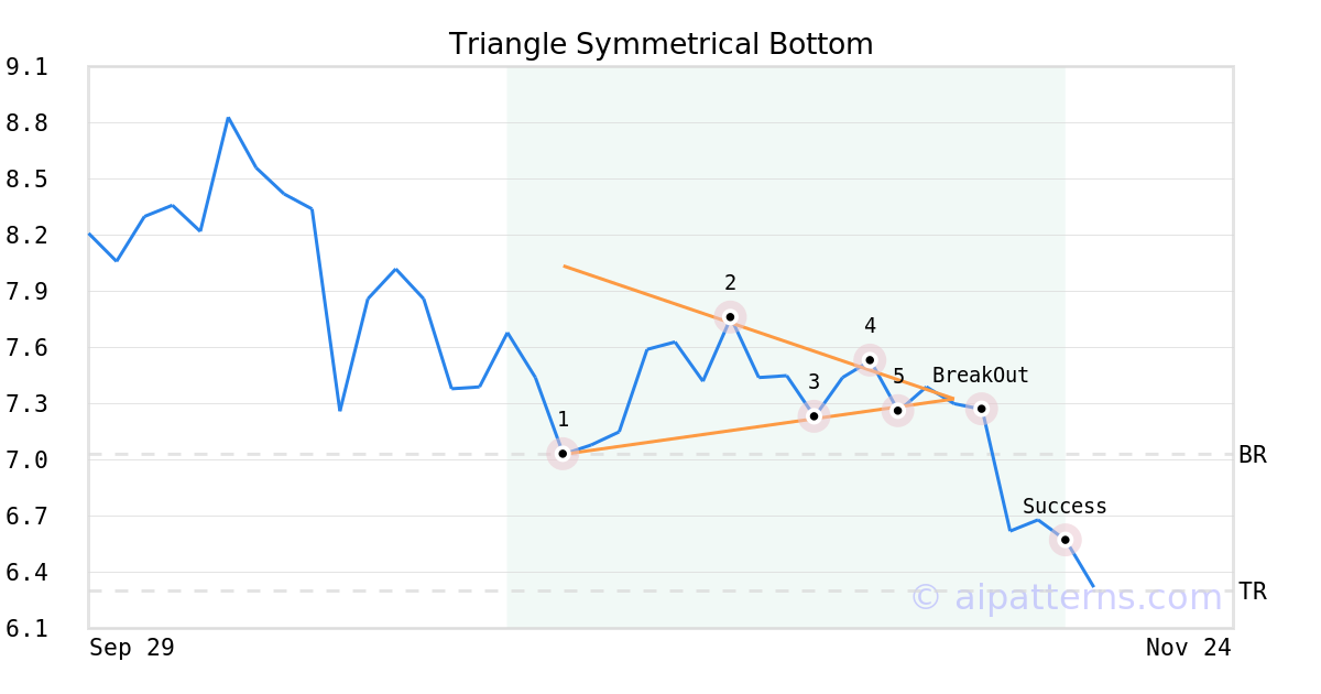On November 07, 2025, A.I.dvisor detected a Triangle Symmetrical Bottom Pattern (Bearish) for Cheetah Mobile (CMCM, $7.26). 5 days later, on November 12, 2025, A.I.dvisor confirmed the Bearish pattern, setting a target price of the stock. On November 17, 2025, the stock hit the target price of $6.30 – resulting in a gain for traders who shorted the stock on the pattern detection date.