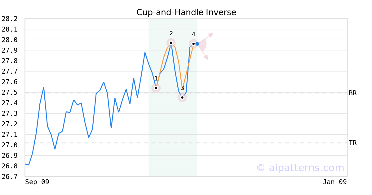 The Inverted Cup-and-Handle (sometimes called Inverted Cup-and-Holder) pattern forms when prices rise then decline to create an upside-down “U”like shape (1, 2, 3, also known as the Cup), followed by a shorter relatively straight price increase that bounces from the right lip (from 3 to 4, creating the Handle).