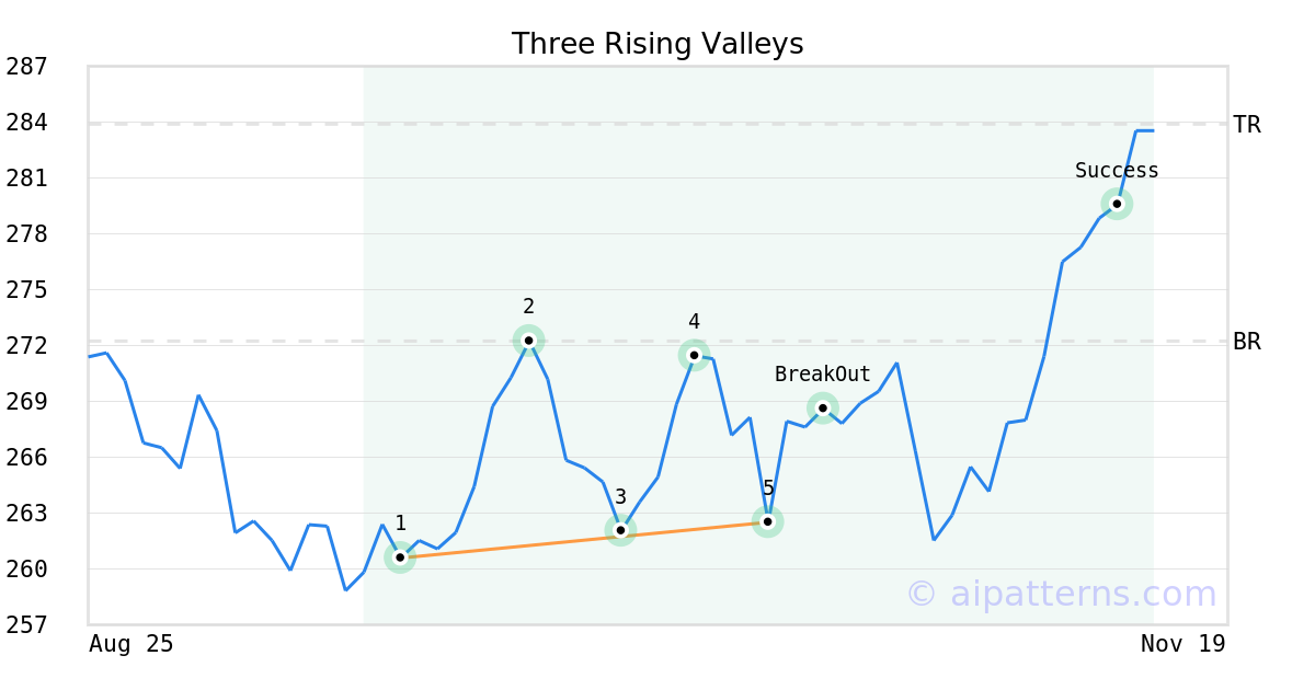 On October 16, 2025, A.I.dvisor detected a Three Rising Valleys Pattern (Bullish) for CME Group (CME, $262.51). On October 21, 2025, A.I.dvisor confirmed the Bullish pattern, setting a target price of $283.89. 22 days later, on November 12, 2025, CME reached the target price resulting in a for traders who took a long position in the stock.