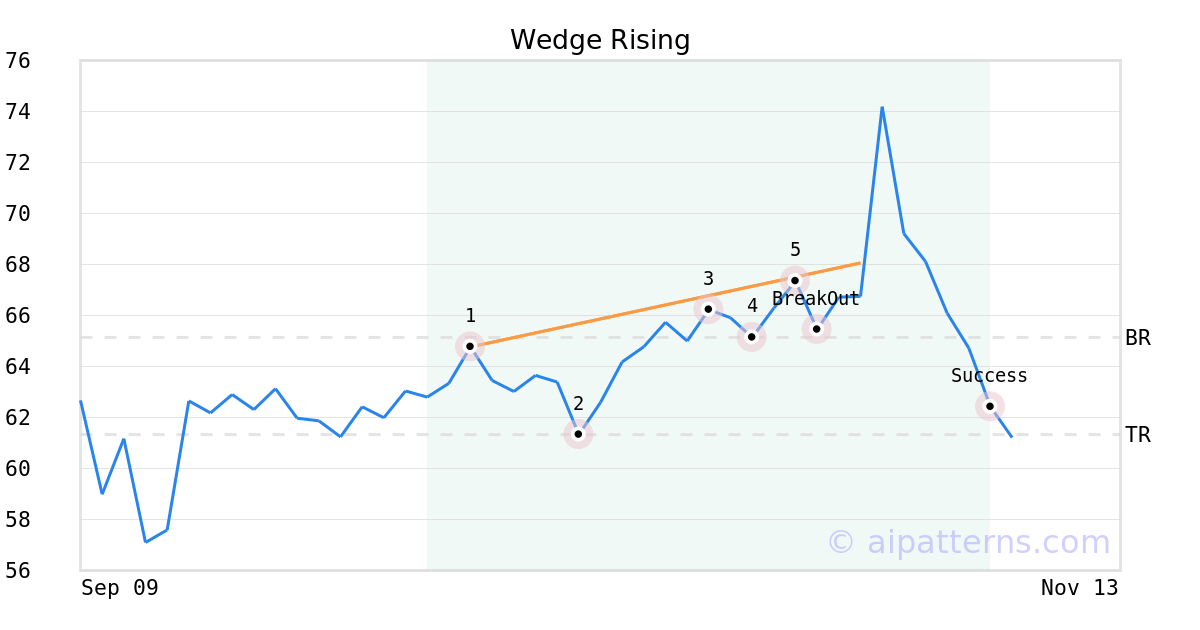 On October 24, 2025, A.I.dvisor detected a Wedge Rising Pattern (Bearish) for Cimpress plc (CMPR, $67.35). 3 days later, on October 27, 2025, A.I.dvisor confirmed the Bearish pattern, setting a target price of the stock. On November 06, 2025, the stock hit the target price of $61.33 – resulting in a gain for traders who shorted the stock on the pattern detection date.