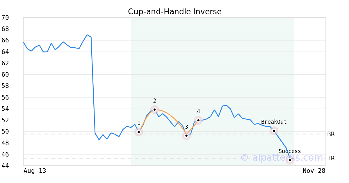 On October 15, 2025, A.I.dvisor detected a Cup-and-Handle Inverse Pattern (Bearish) for Core & Main (CNM, $51.94). 27 days later, on November 11, 2025, A.I.dvisor confirmed the Bearish pattern, setting a target price of the stock. On November 17, 2025, the stock hit the target price of $45.31 – resulting in a +1 gain for traders who shorted the stock on the pattern detection date.