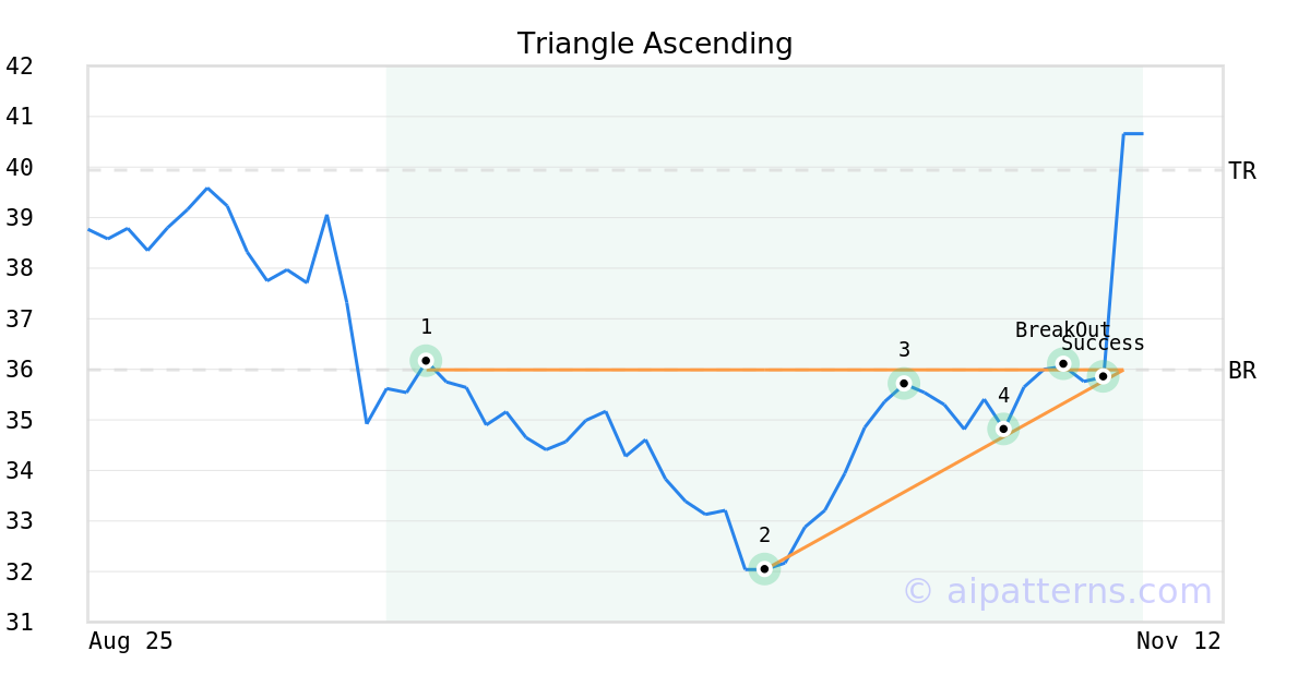 On November 03, 2025, A.I.dvisor detected a Triangle Ascending Pattern (Bullish) for Collegium Pharmaceutical (COLL, $36.10). On November 03, 2025, A.I.dvisor confirmed the Bullish pattern, setting a target price of $39.94. 2 days later, on November 05, 2025, COLL reached the target price resulting in a for traders who took a long position in the stock.