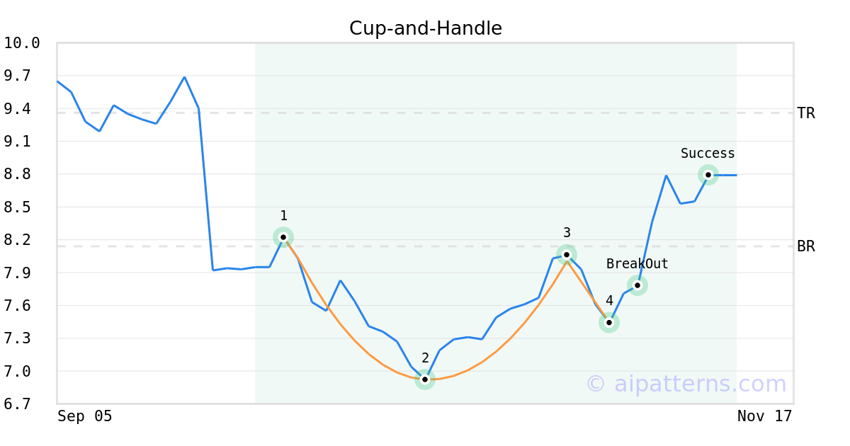 On October 30, 2025, A.I.dvisor detected a Cup-and-Handle Pattern (Bullish) for Compass (COMP, $7.44). On November 03, 2025, A.I.dvisor confirmed the Bullish pattern, setting a target price of $9.36. 7 days later, on November 10, 2025, COMP reached the target price resulting in a +1 for traders who took a long position in the stock.
