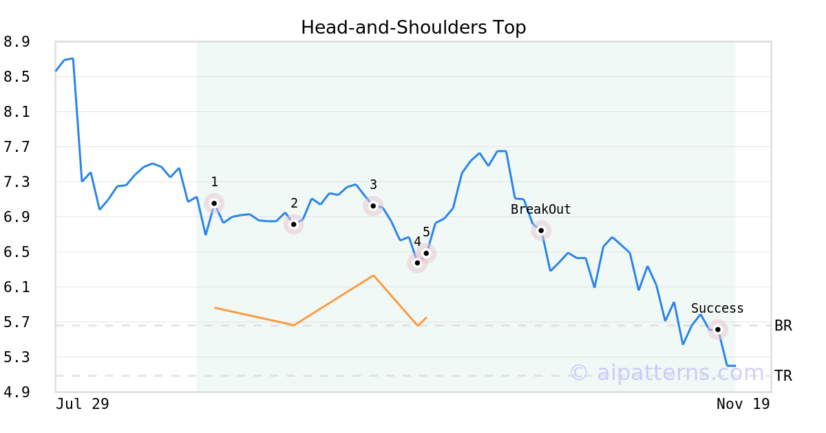 On September 26, 2025, A.I.dvisor detected a Head-and-Shoulders Top Pattern (Bearish) for YieldMax COIN Option Income Strategy ETF (CONY, $5.75). 19 days later, on October 15, 2025, A.I.dvisor confirmed the Bearish pattern, setting a target price of the stock. On November 12, 2025, the stock hit the target price of $5.09 – resulting in a gain for traders who shorted the stock on the pattern detection date.