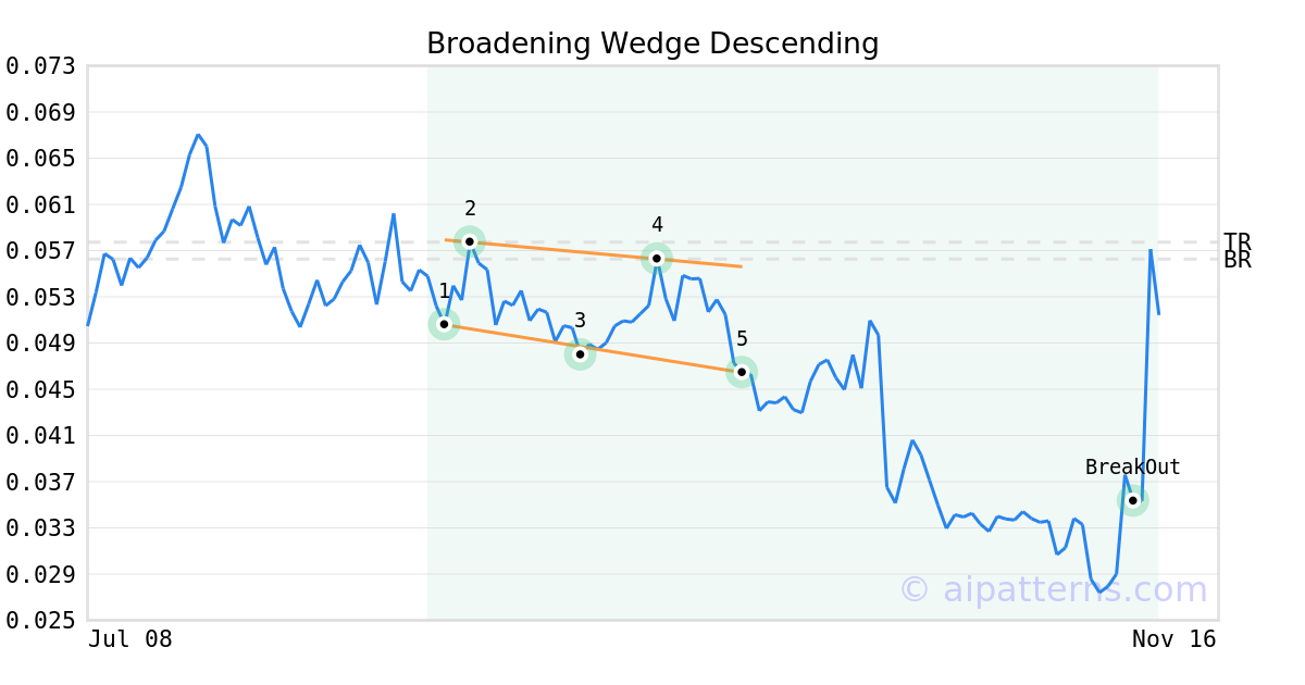 On September 23, 2025, A.I.dvisor detected a Broadening Wedge Descending Pattern (Bullish) for COTI cryptocurrency (COTI.X, $0.046510). On November 08, 2025, A.I.dvisor confirmed the Bullish pattern, setting a target price of $0.057730. On November 08, 2025, COTI.X reached the target price resulting in a +2 for traders who took a long position in the stock.