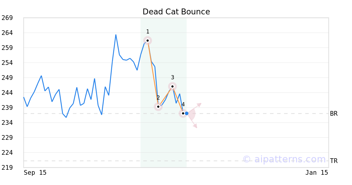 The Dead Cat Bounce pattern appears when a security's price falls quickly but has a temporary “v-shaped” recovery before resuming its downward trend.