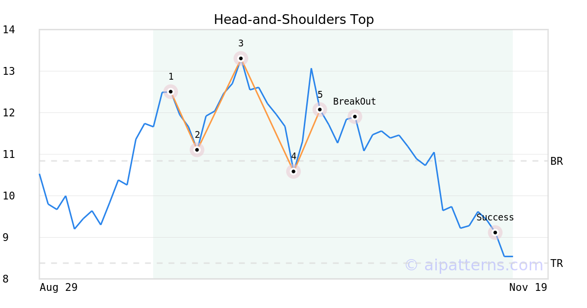 On October 15, 2025, A.I.dvisor detected a Head-and-Shoulders Top Pattern (Bearish) for Cerence (CRNC, $12.07). 6 days later, on October 21, 2025, A.I.dvisor confirmed the Bearish pattern, setting a target price of the stock. On November 12, 2025, the stock hit the target price of $8.38 – resulting in a +2 gain for traders who shorted the stock on the pattern detection date.