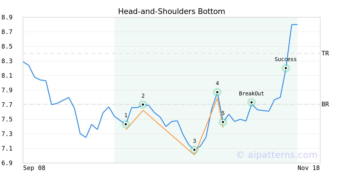 On October 27, 2025, A.I.dvisor detected a Head-and-Shoulders Bottom Pattern (Bullish) for Cross Timbers Royalty Trust (CRT, $7.39). On November 03, 2025, A.I.dvisor confirmed the Bullish pattern, setting a target price of $8.40. 8 days later, on November 11, 2025, CRT reached the target price resulting in a +1 for traders who took a long position in the stock.