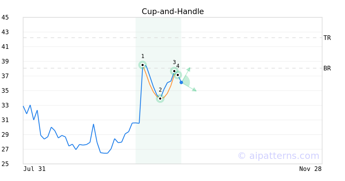 A.I.dvisor detected a bullish Cup-and-Handle pattern for CRWL stock. This pattern was detected on October 02, 2025 . The odds of reaching the target price are 6. The Cup-and-Handle (sometimes called Cup-and-Holder) pattern is formed when the price of a security initially declines and then rises to form a “U”-like rounded shape (1, 2, 3, also known as the Cup). Once it forms the right lip, it is characterized by short, relatively straight price decline (from 3 to 4) forming the handle. Consider buying a security or call option at the upward breakout price/entry point. The confirmation move is when the security moves past the breakout price above the right cup lip.