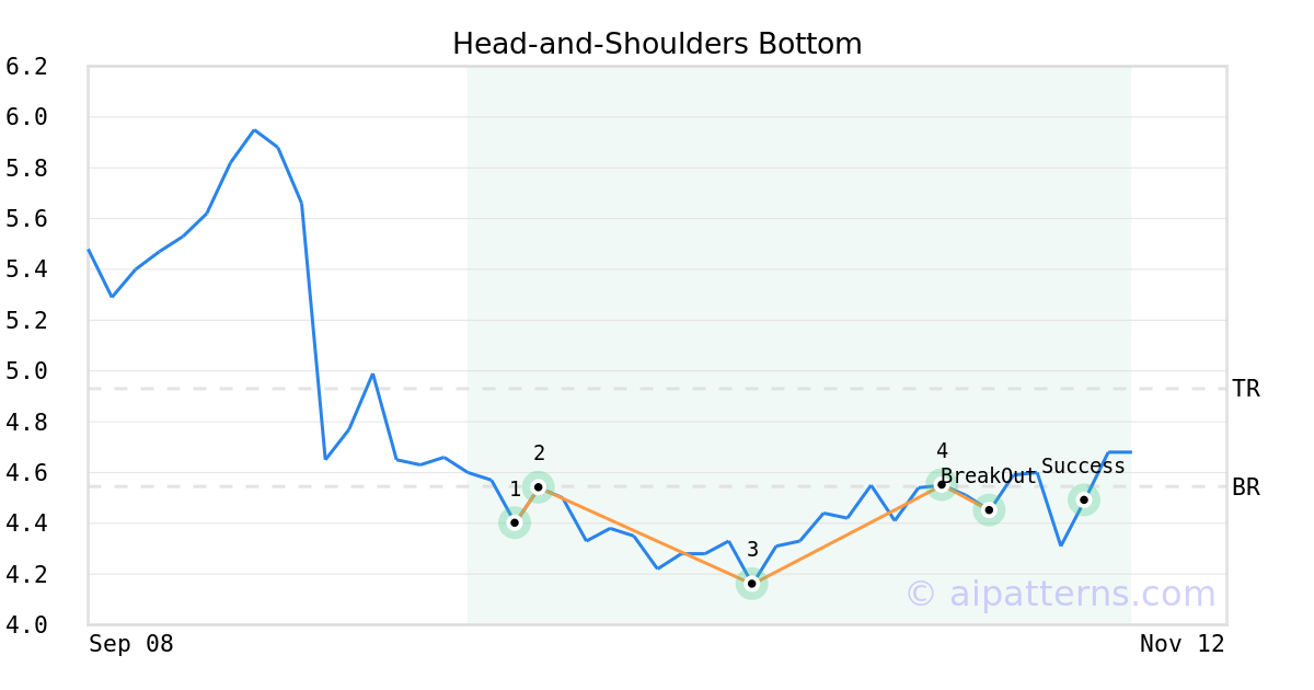 On October 30, 2025, A.I.dvisor detected a Head-and-Shoulders Bottom Pattern (Bullish) for Cosan SA (CSAN, $4.45). On October 30, 2025, A.I.dvisor confirmed the Bullish pattern, setting a target price of $4.93. 6 days later, on November 05, 2025, CSAN reached the target price resulting in a for traders who took a long position in the stock.