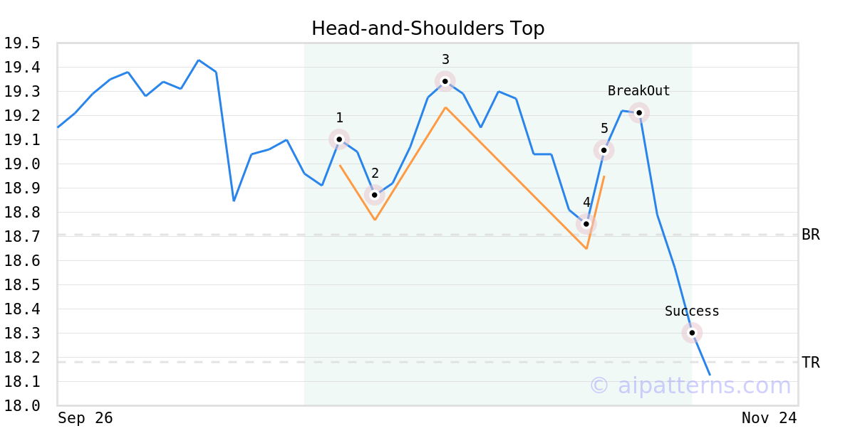 On November 10, 2025, A.I.dvisor detected a Head-and-Shoulders Top Pattern (Bearish) for Calamos Strategic Total Return (CSQ, $18.95). 2 days later, on November 12, 2025, A.I.dvisor confirmed the Bearish pattern, setting a target price of the stock. On November 17, 2025, the stock hit the target price of $18.18 – resulting in a gain for traders who shorted the stock on the pattern detection date.