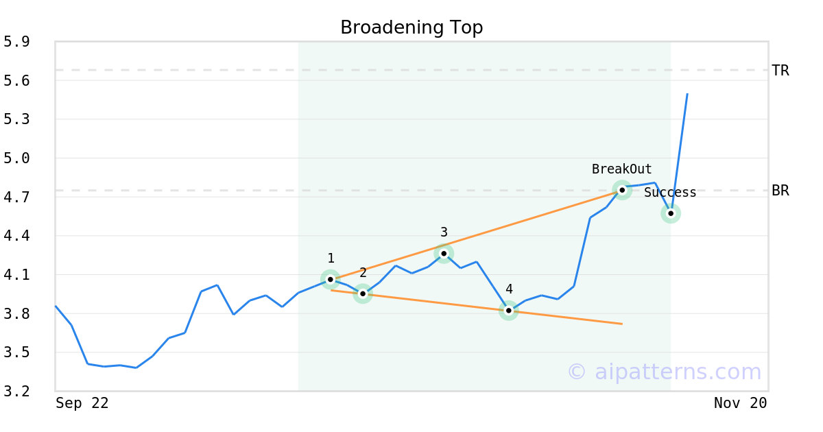 On November 10, 2025, A.I.dvisor detected a Broadening Top Pattern (Bullish) for Cytek Biosciences (CTKB, $4.75). On November 10, 2025, A.I.dvisor confirmed the Bullish pattern, setting a target price of $5.68. 3 days later, on November 13, 2025, CTKB reached the target price resulting in a for traders who took a long position in the stock.