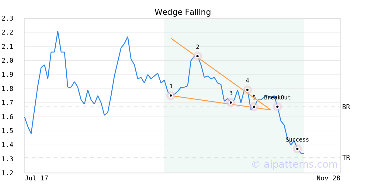 On October 23, 2025, A.I.dvisor detected a Wedge Falling Pattern (Bearish) for Citius Oncology Inc (CTOR, $1.67). 11 days later, on November 03, 2025, A.I.dvisor confirmed the Bearish pattern, setting a target price of the stock. On November 11, 2025, the stock hit the target price of $1.31 – resulting in a +1 gain for traders who shorted the stock on the pattern detection date.