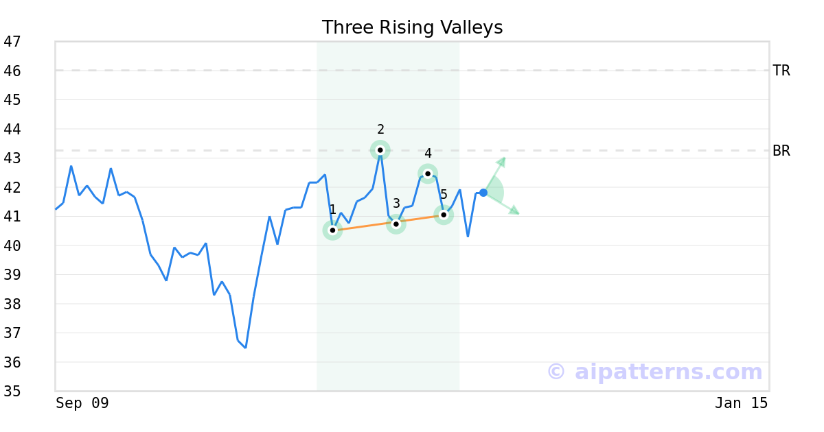 The Three Rising Valleys pattern forms when three minor Lows (1, 3, 5) are arranged along an upward sloping trend line.