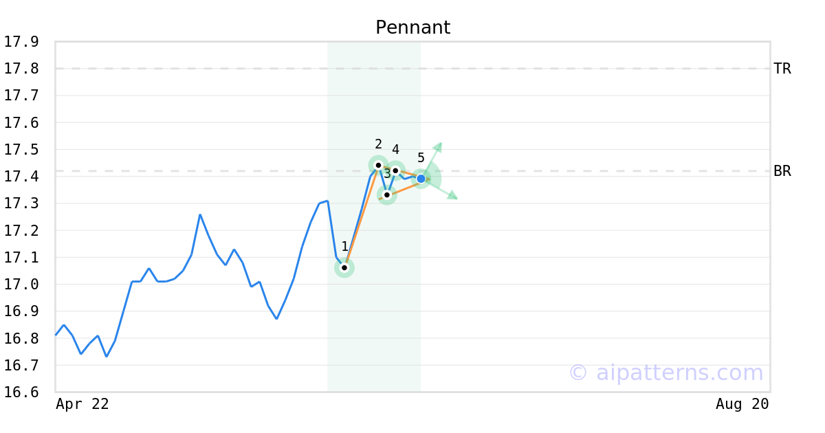The Rising Pennant forms when rising prices experience a consolidation period, and the price moves within a narrow range defined by the converging lines through points (2, 4) and (3, 5).