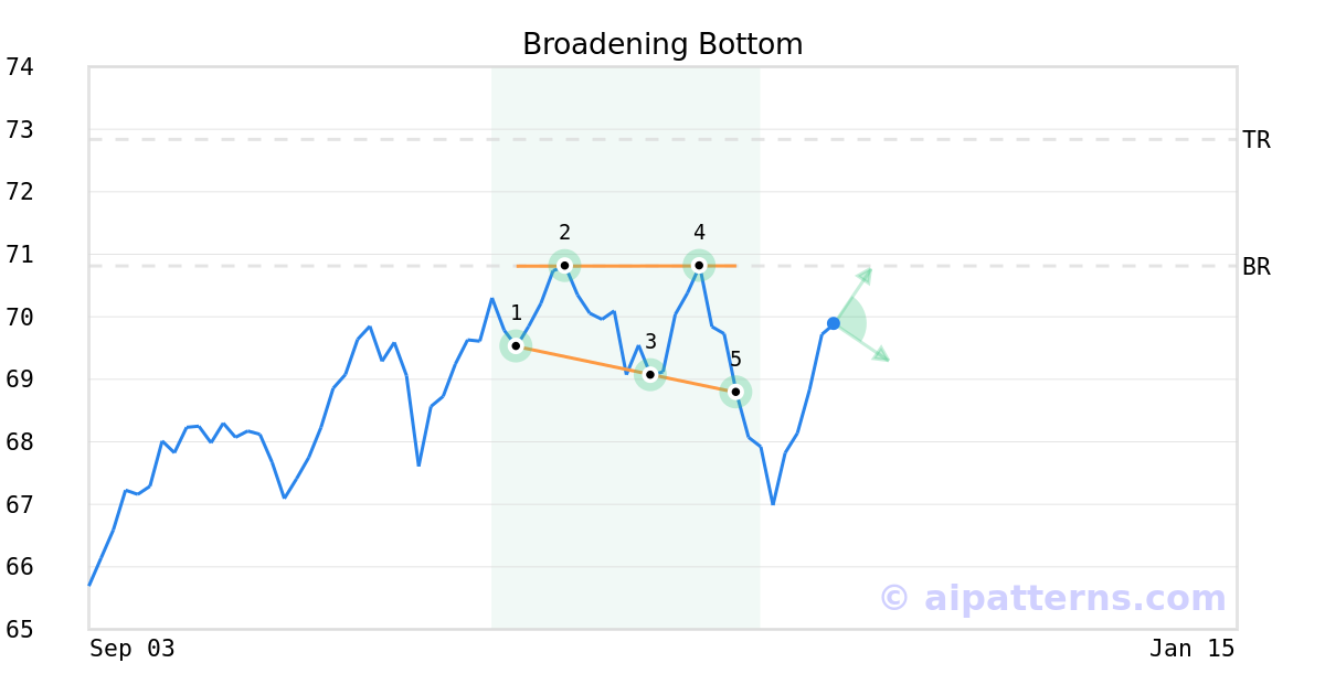 The Broadening Bottom pattern is formed when the price of a security progressively makes higher highs (2, 4) and lower lows (1, 3, 5) following two widening trend lines.