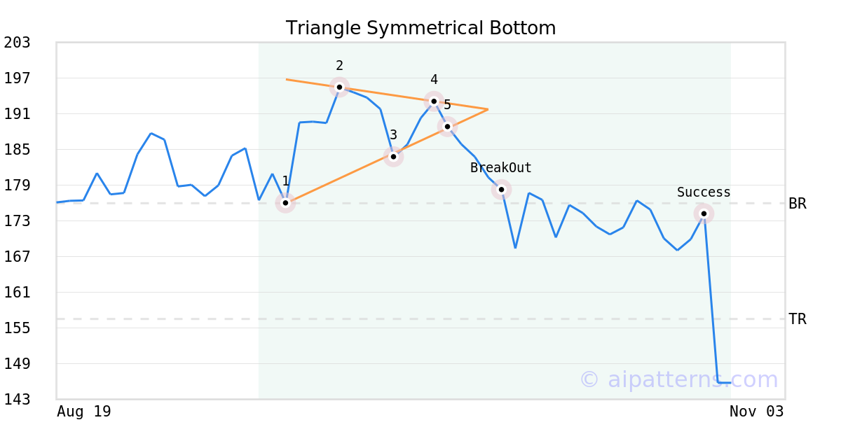 On September 30, 2025, A.I.dvisor detected a Triangle Symmetrical Bottom Pattern (Bearish) for Commvault Systems (CVLT, $188.78). 6 days later, on October 06, 2025, A.I.dvisor confirmed the Bearish pattern, setting a target price of the stock. On October 27, 2025, the stock hit the target price of $156.51 – resulting in a gain for traders who shorted the stock on the pattern detection date.