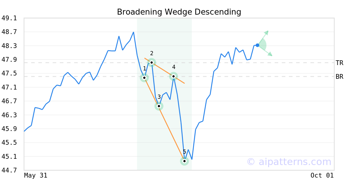 The Broadening Wedge Descending pattern forms when the price of a security makes lower lows (1, 3, 5) and lower highs (2, 4), forming a downtrend.