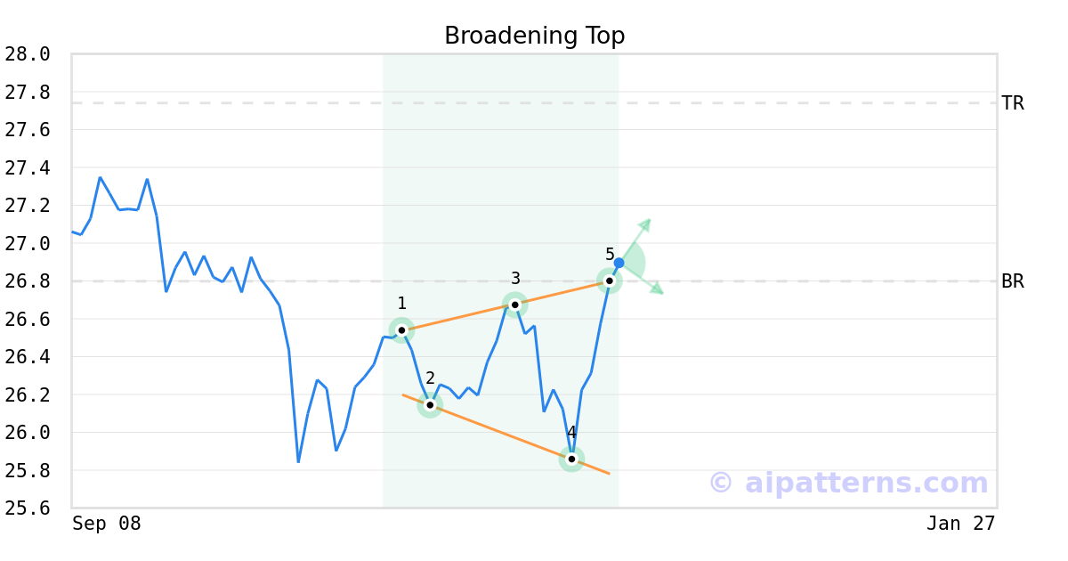 A.I.dvisor detected a bullish Broadening Top pattern for CVY stock. This pattern was detected on November 26, 2025 . The odds of reaching the target price are 6.