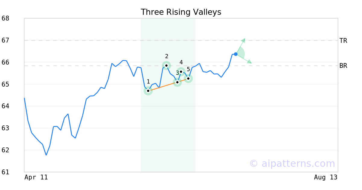 A.I.dvisor detected a bullish Three Rising Valleys pattern for CWGFX stock. This pattern was detected on June 14, 2024 . The odds of reaching the target price are 6. The Three Rising Valleys pattern forms when three minor Lows (1, 3, 5) are arranged along an upward sloping trend line. Consider buying a security or call option at the breakout price level. When trading, wait for the confirmation move, which is when the price rises above the breakout level.