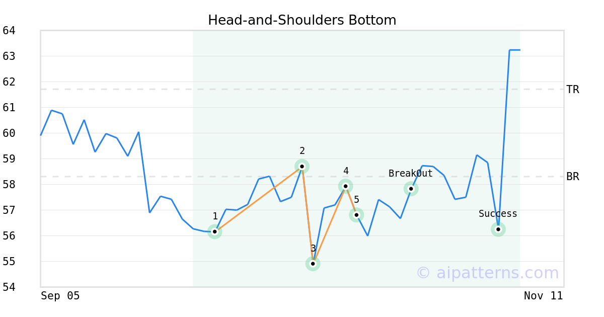 On October 16, 2025, A.I.dvisor detected a Head-and-Shoulders Bottom Pattern (Bullish) for Diebold Nixdorf (DBD, $56.80). On October 23, 2025, A.I.dvisor confirmed the Bullish pattern, setting a target price of $61.71. 12 days later, on November 04, 2025, DBD reached the target price resulting in a for traders who took a long position in the stock.