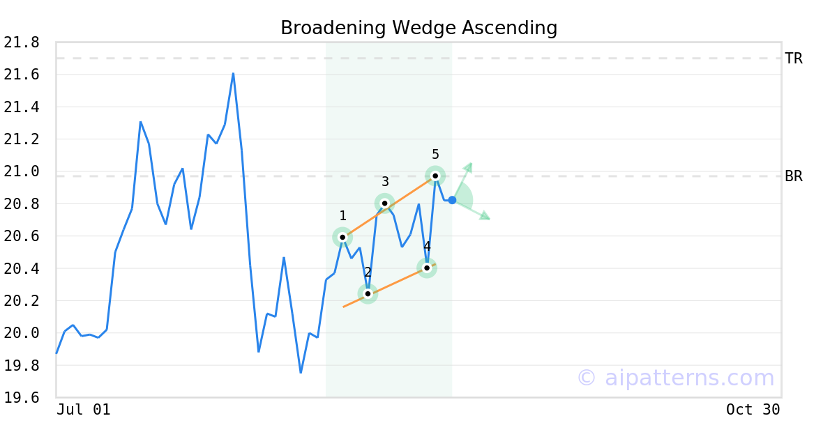 The Broadening Wedge Ascending pattern forms when the price of a security progressively makes higher highs (1, 3) and higher lows (2, 4), following two widening trend lines.
