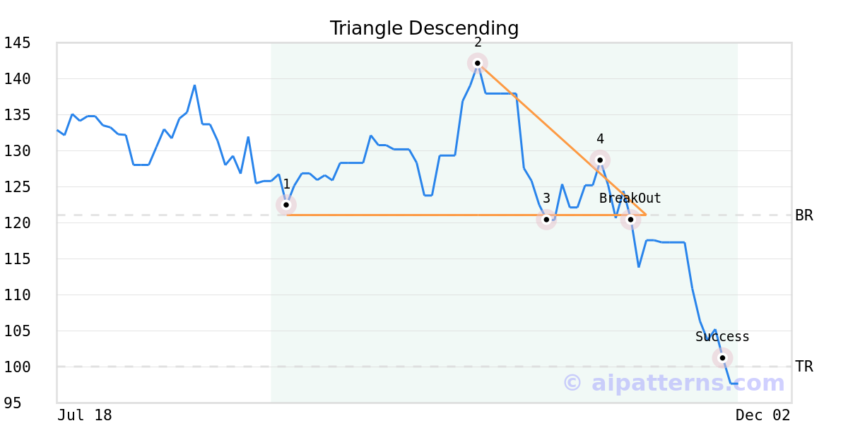 On November 03, 2025, A.I.dvisor detected a Triangle Descending Pattern (Bearish) for Hashdex Bitcoin ETF (DEFI, $120.41). On November 03, 2025, A.I.dvisor confirmed the Bearish pattern, setting a target price of the stock. On November 19, 2025, the stock hit the target price of $100.06 – resulting in a +1 gain for traders who shorted the stock on the pattern detection date.