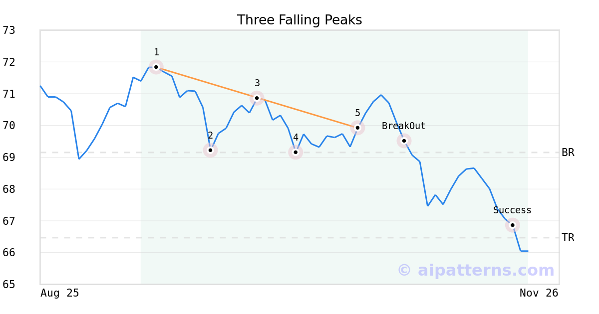 On October 22, 2025, A.I.dvisor detected a Three Falling Peaks Pattern (Bearish) for WisdomTree Europe SmallCap Dividend ETF (DFE, $69.92). 8 days later, on October 30, 2025, A.I.dvisor confirmed the Bearish pattern, setting a target price of the stock. On November 19, 2025, the stock hit the target price of $66.47 – resulting in a gain for traders who shorted the stock on the pattern detection date.