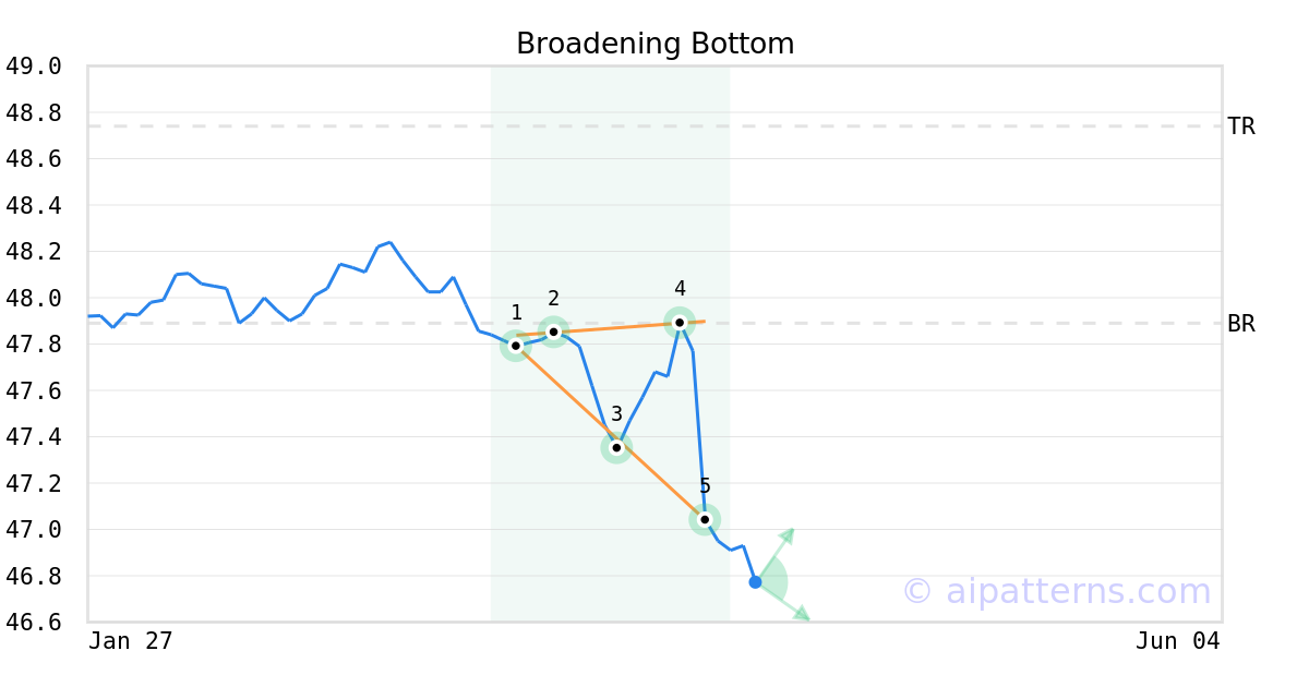 The Broadening Bottom pattern is formed when the price of a security progressively makes higher highs (2, 4) and lower lows (1, 3, 5) following two widening trend lines.