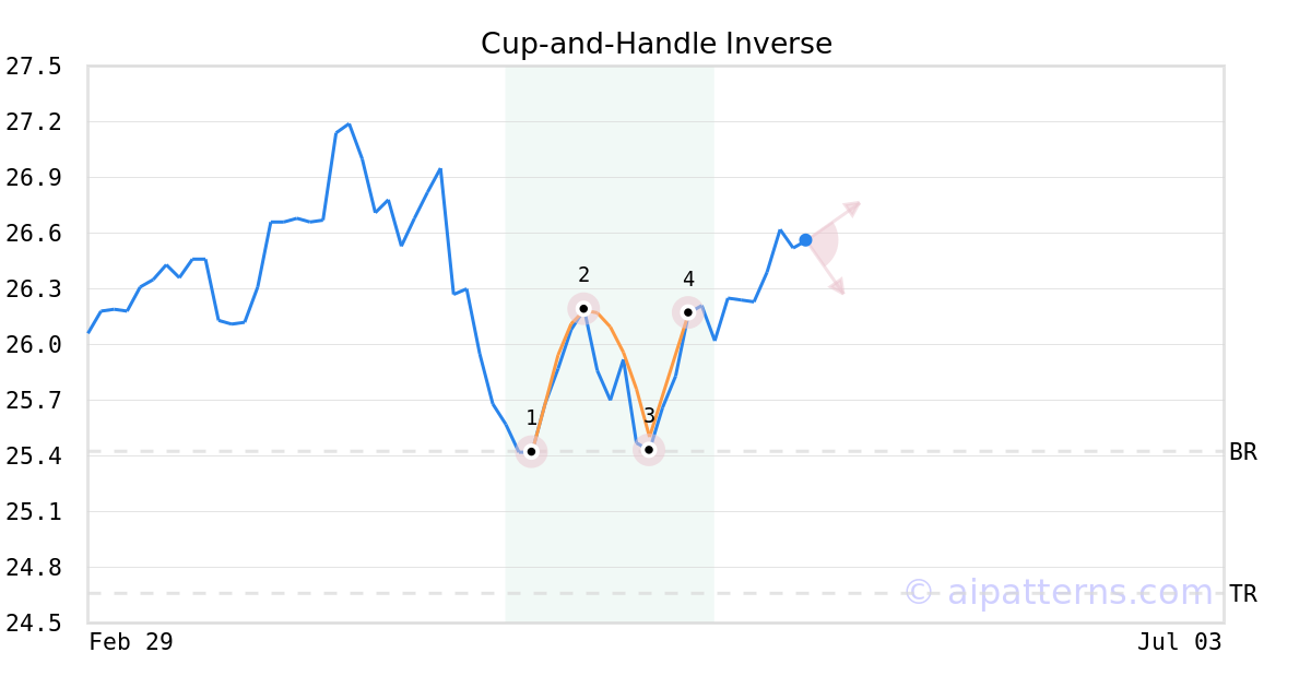 The Inverted Cup-and-Handle (sometimes called Inverted Cup-and-Holder) pattern forms when prices rise then decline to create an upside-down “U”like shape (1, 2, 3, also known as the Cup), followed by a shorter relatively straight price increase that bounces from the right lip (from 3 to 4, creating the Handle).