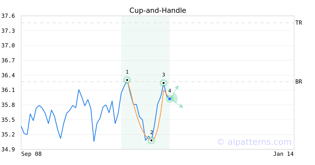 The Cup-and-Handle (sometimes called Cup-and-Holder) pattern is formed when the price of a security initially declines and then rises to form a “U”-like rounded shape (1, 2, 3, also known as the Cup). Once it forms the right lip, it is characterized by short, relatively straight price decline (from 3 to 4) forming the handle.