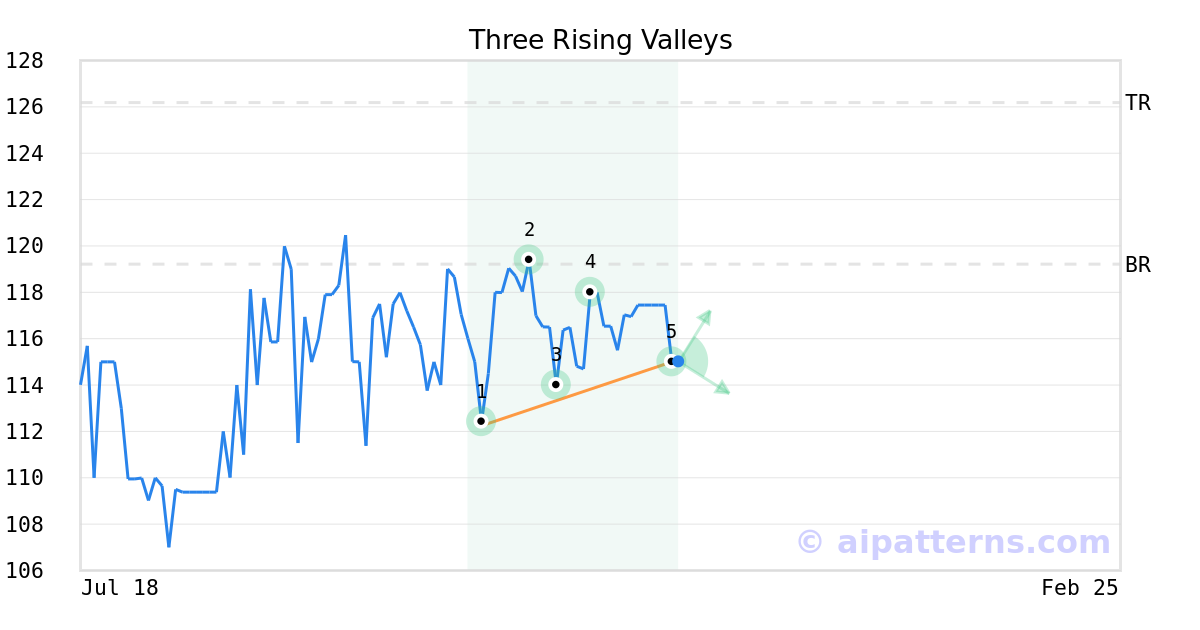 The Three Rising Valleys pattern forms when three minor Lows (1, 3, 5) are arranged along an upward sloping trend line.