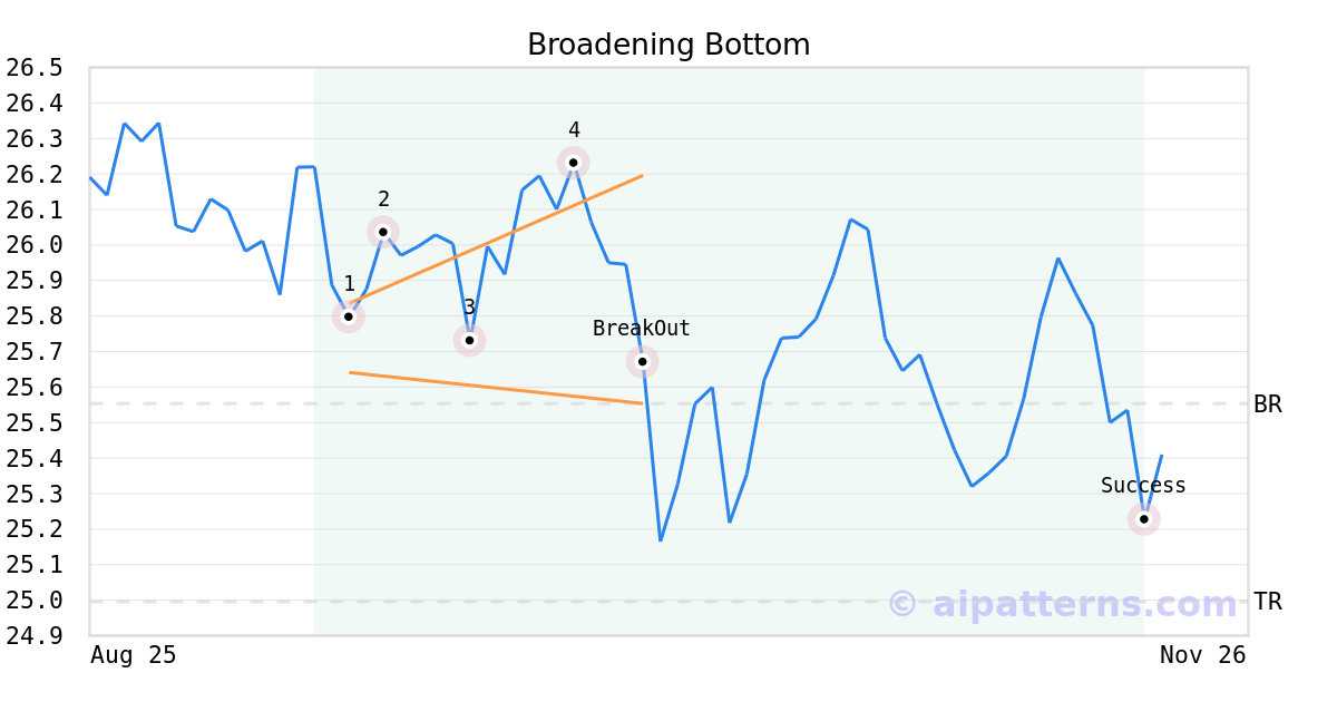 On October 09, 2025, A.I.dvisor detected a Broadening Bottom Pattern (Bearish) for Sound Equity Dividend Income ETF (DIVY, $25.55). On October 09, 2025, A.I.dvisor confirmed the Bearish pattern, setting a target price of the stock. On November 19, 2025, the stock hit the target price of $25.00 – resulting in a gain for traders who shorted the stock on the pattern detection date.