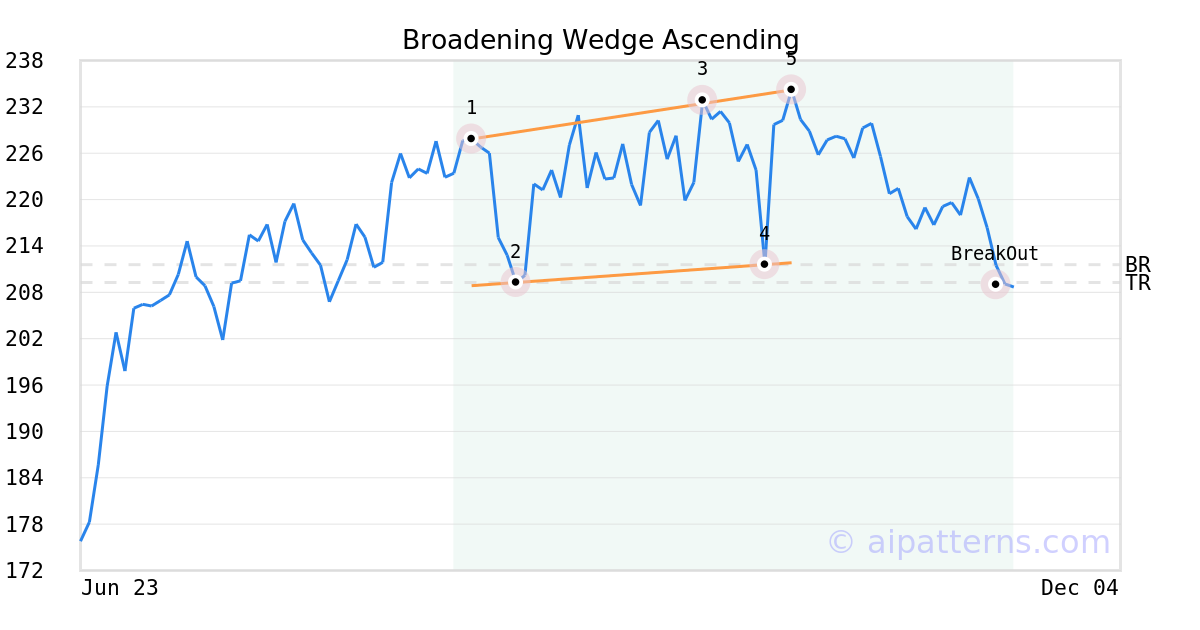 On October 15, 2025, A.I.dvisor detected a Broadening Wedge Ascending Pattern (Bearish) for Dick's Sporting Goods (DKS, $234.20). 33 days later, on November 17, 2025, A.I.dvisor confirmed the Bearish pattern, setting a target price of the stock. On November 17, 2025, the stock hit the target price of $209.27 – resulting in a +1 gain for traders who shorted the stock on the pattern detection date.
