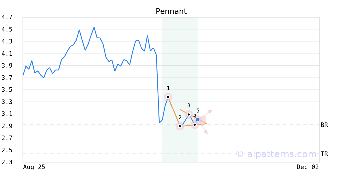 A.I.dvisor detected a bearish Pennant pattern for DOT.X stock. This pattern was detected on October 23, 2025 . The odds of reaching the target price are 6.