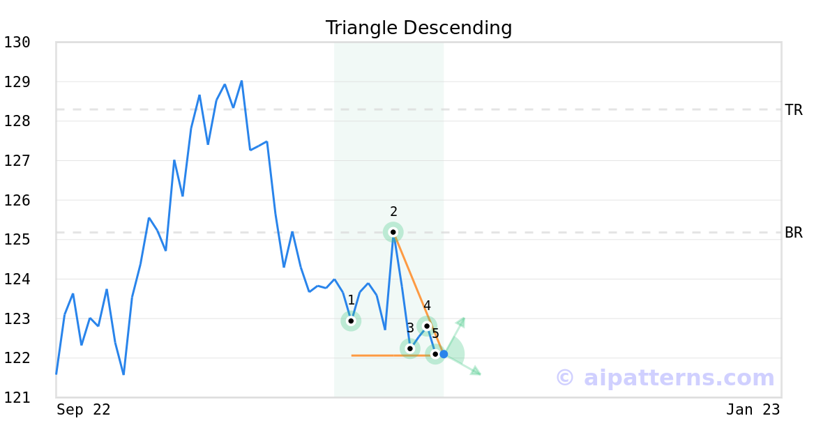 The Descending Triangle pattern is formed when the price of a security establishes a support level (1, 3, 5) and bounces off that level to a declining resistance level, creating a down-sloping top line (2, 4).