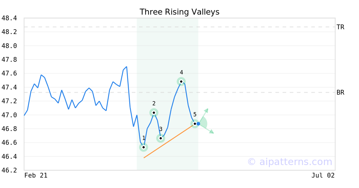 The Three Rising Valleys pattern forms when three minor Lows (1, 3, 5) are arranged along an upward sloping trend line.