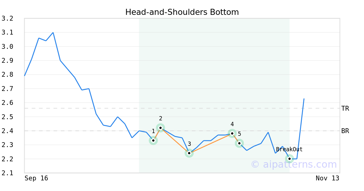On October 28, 2025, A.I.dvisor detected a Head-and-Shoulders Bottom Pattern (Bullish) for Eventbrite (EB, $2.31). On November 06, 2025, A.I.dvisor confirmed the Bullish pattern, setting a target price of $2.56. On November 06, 2025, EB reached the target price resulting in a for traders who took a long position in the stock.
