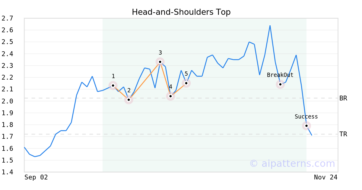 On October 15, 2025, A.I.dvisor detected a Head-and-Shoulders Top Pattern (Bearish) for ECARX Holdings (ECX, $2.15). 26 days later, on November 10, 2025, A.I.dvisor confirmed the Bearish pattern, setting a target price of the stock. On November 17, 2025, the stock hit the target price of $1.72 – resulting in a +1 gain for traders who shorted the stock on the pattern detection date.