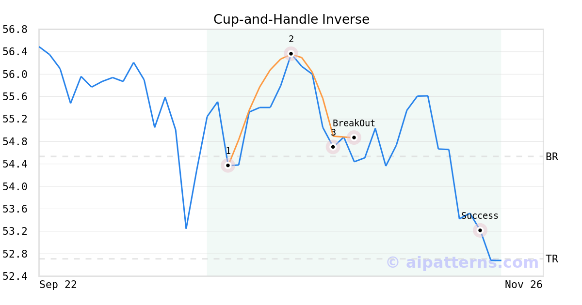 On November 03, 2025, A.I.dvisor detected a Cup-and-Handle Inverse Pattern (Bearish) for WisdomTree US SmallCap Earnings ETF (EES, $54.87). On November 03, 2025, A.I.dvisor confirmed the Bearish pattern, setting a target price of the stock. On November 19, 2025, the stock hit the target price of $52.71 – resulting in a gain for traders who shorted the stock on the pattern detection date.