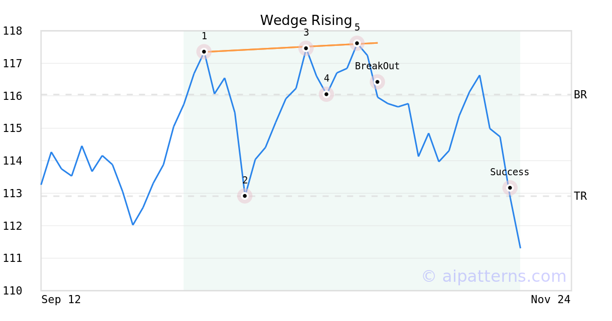 On October 27, 2025, A.I.dvisor detected a Wedge Rising Pattern (Bearish) for iShares MSCI EAFE Growth ETF (EFG, $117.61). 2 days later, on October 29, 2025, A.I.dvisor confirmed the Bearish pattern, setting a target price of the stock. On November 17, 2025, the stock hit the target price of $112.91 – resulting in a gain for traders who shorted the stock on the pattern detection date.