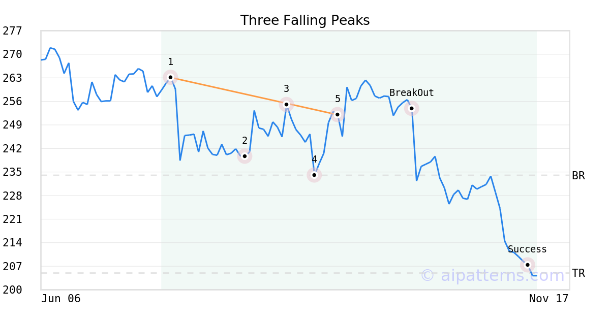 On September 09, 2025, A.I.dvisor detected a Three Falling Peaks Pattern (Bearish) for Equifax (EFX, $252.01). 22 days later, on October 01, 2025, A.I.dvisor confirmed the Bearish pattern, setting a target price of the stock. On November 05, 2025, the stock hit the target price of $204.97 – resulting in a +1 gain for traders who shorted the stock on the pattern detection date.
