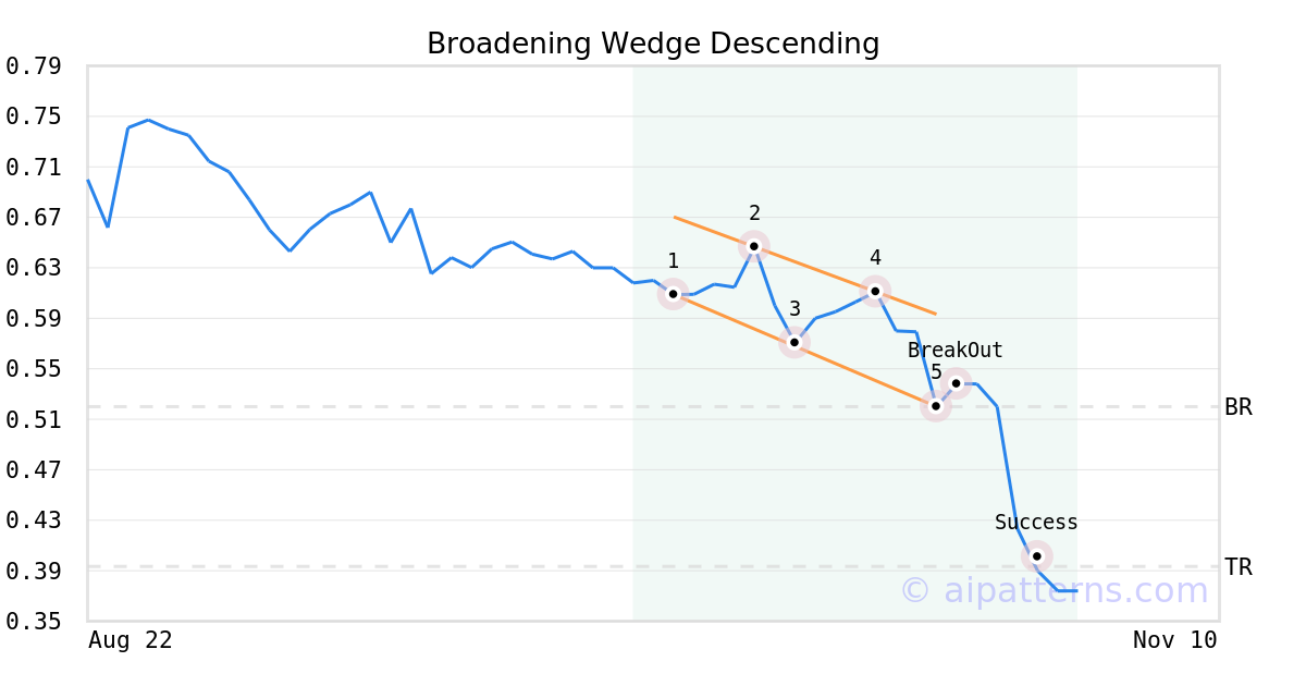 On October 22, 2025, A.I.dvisor detected a Broadening Wedge Descending Pattern (Bearish) for Eshallgo Inc. (EHGO, $0.52). 1 day later, on October 23, 2025, A.I.dvisor confirmed the Bearish pattern, setting a target price of the stock. On October 29, 2025, the stock hit the target price of $0.39 – resulting in a +2 gain for traders who shorted the stock on the pattern detection date.