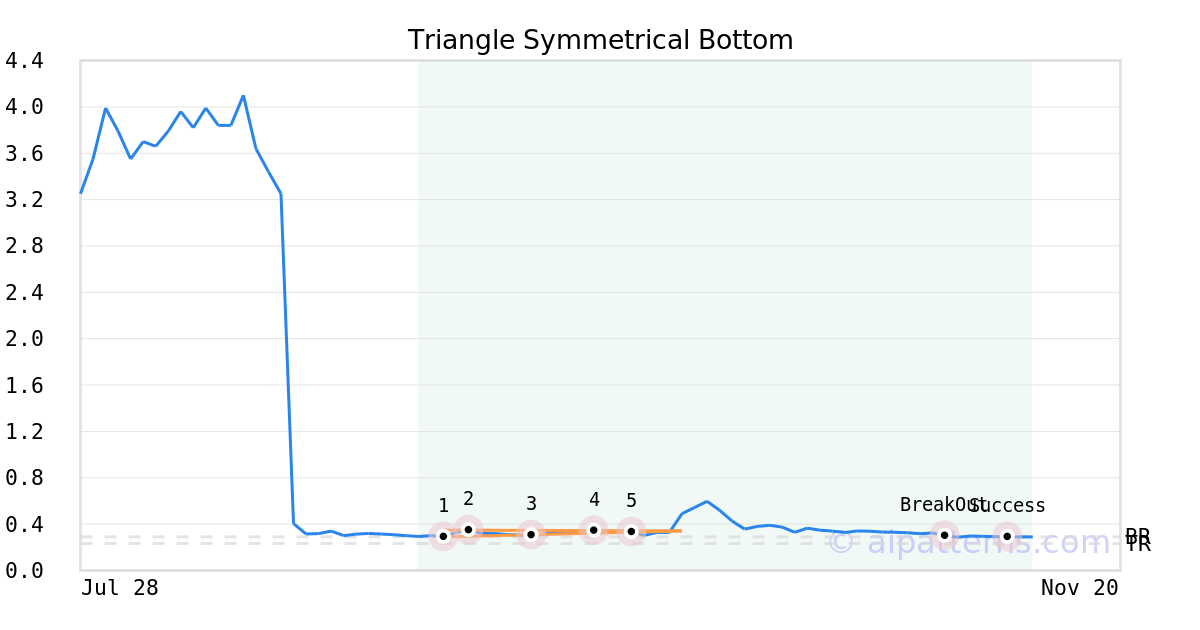 On September 29, 2025, A.I.dvisor detected a Triangle Symmetrical Bottom Pattern (Bearish) for Elong Power Holding Limited (ELPW, $0.33). 35 days later, on November 03, 2025, A.I.dvisor confirmed the Bearish pattern, setting a target price of the stock. On November 10, 2025, the stock hit the target price of $0.23 – resulting in a +1 gain for traders who shorted the stock on the pattern detection date.