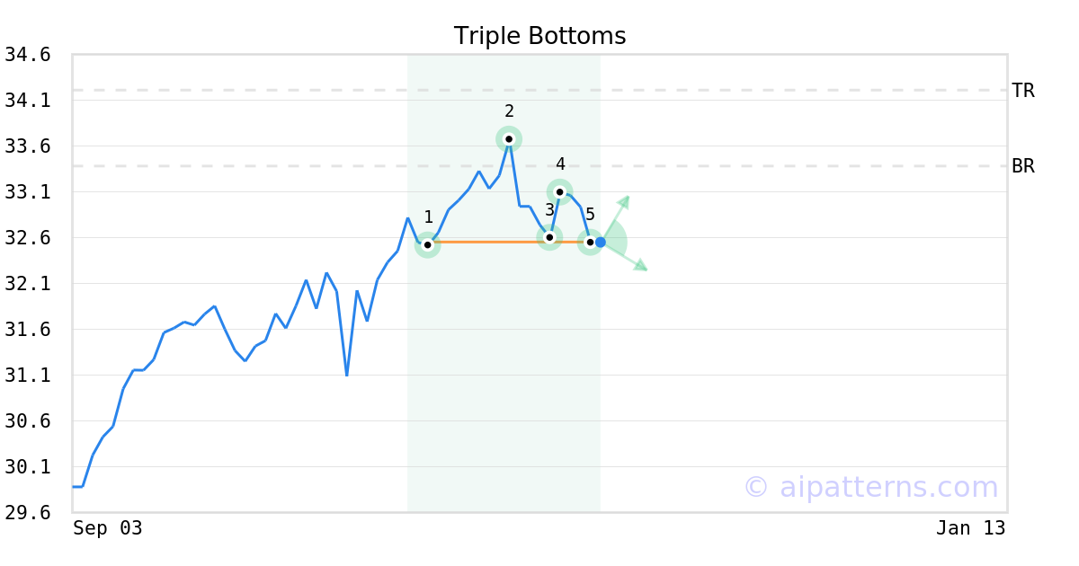 The Triple Bottom pattern appears when there are three distinct low points (1, 3, 5) that represent a consistent support level.